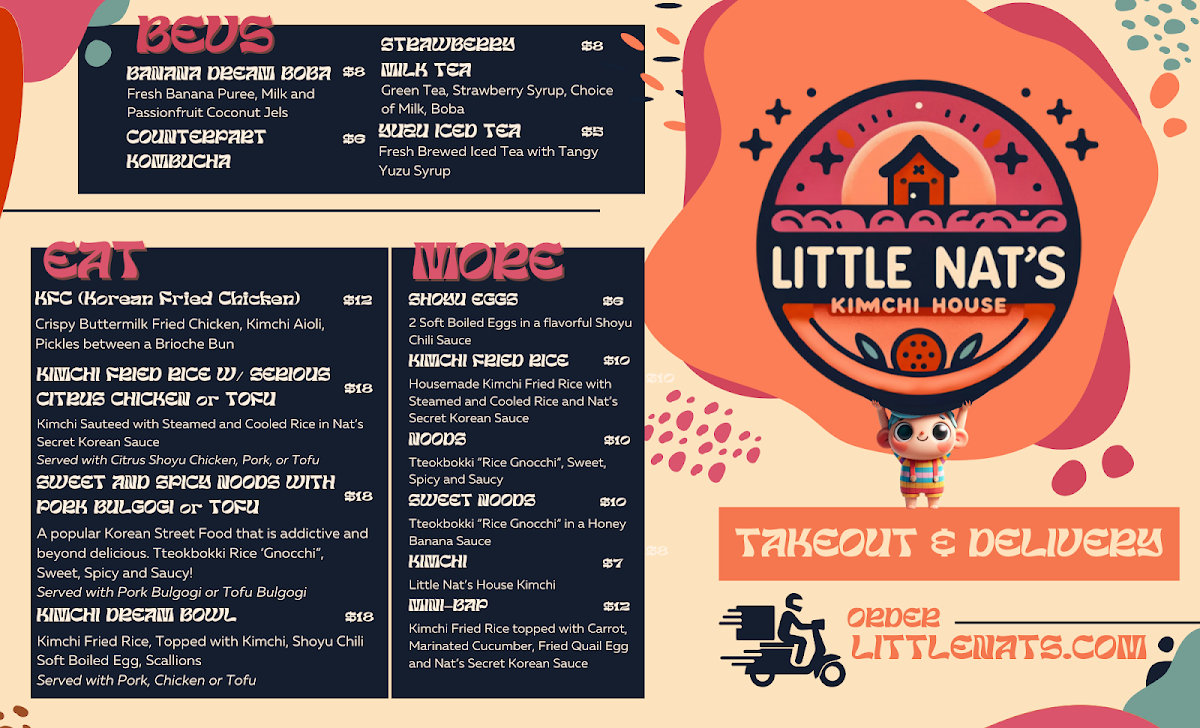 The menu at Little Nat's Kimchi House offers a bold and satisfying exploration of Korean comfort food with standout dishes that deliver both flavor and authenticity. The Korean Fried Chicken Sandwich is a perfect fusion of crispy texture and juicy, seasoned meat, offering a satisfying crunch with each bite and layered with sauces that balance heat and tang. For a classic Korean favorite, the Tteok-Bokki brings chewy rice cakes in a rich, spicy gochujang sauce that captures the essence of street food culture with every bite. Another highlight is the Kimchi Fried Rice, which showcases the fermented tang of kimchi stirred through perfectly fried rice, often topped with a fried egg for added richness and umami depth. Each dish reflects careful attention to traditional flavors while maintaining a casual, approachable atmosphere that appeals to both longtime Korean food lovers and newcomers. The menu as a whole is thoughtfully composed, offering hearty, flavorful options that celebrate the boldness and soul of Korean cuisine.